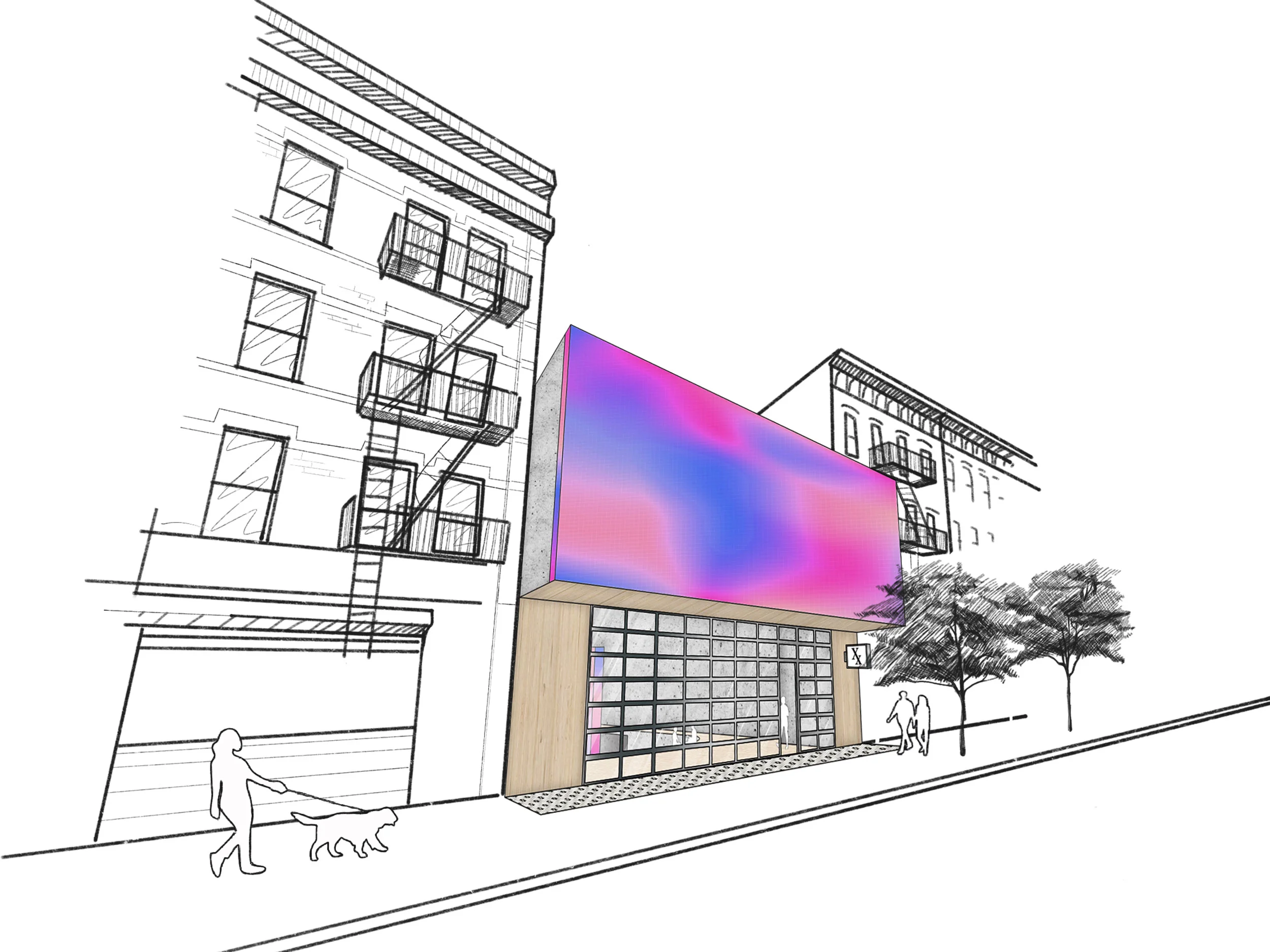 A monolithic structure juts out into the public sidewalk creating a cave-like entrance while encased with mesmerizing gradient screens. The screen displays a rolling gradient when not in use for an event. The main space is used as a communal lounge or meditation space when not activated by an event.